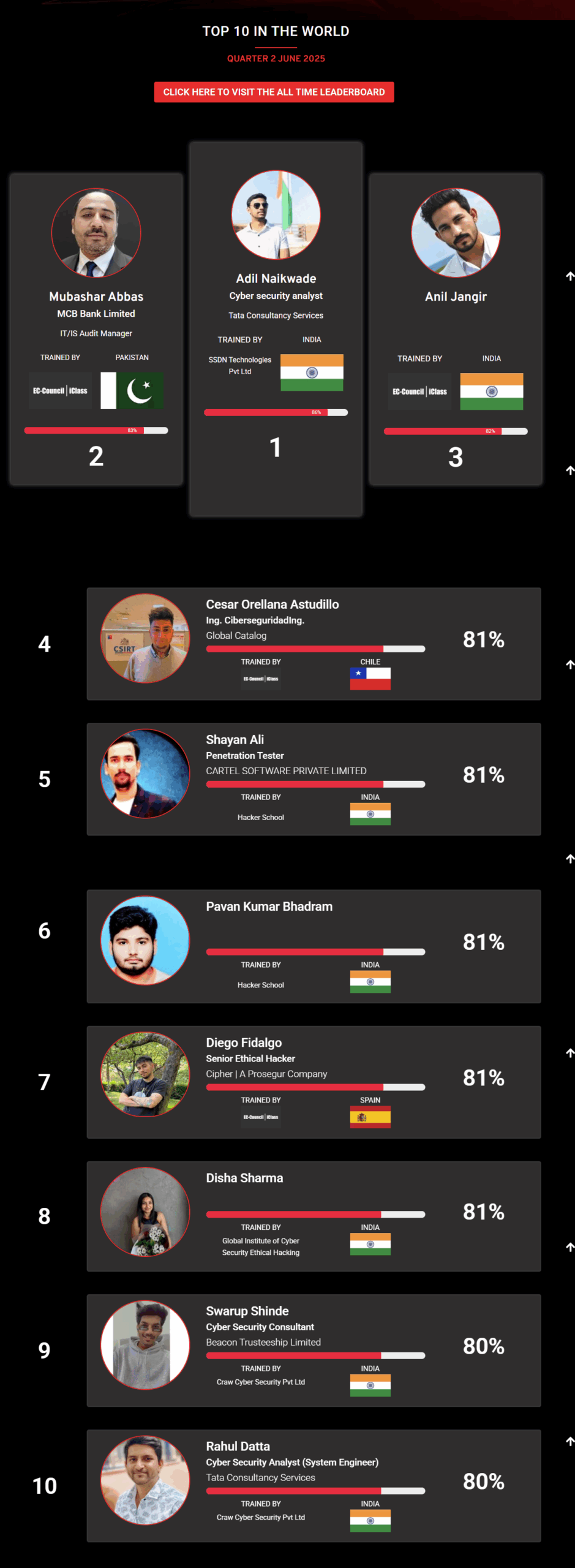 To feature on the leaderboard, you will have to pass both, the CEH knowledge-based MCQ (v8 and above) and the CEH Practical exam, thereby attaining the CEH (Master) credential. Scoring is based on the marks obtained and time taken to pass the exam. EFFICIENCY IS THE KEY.