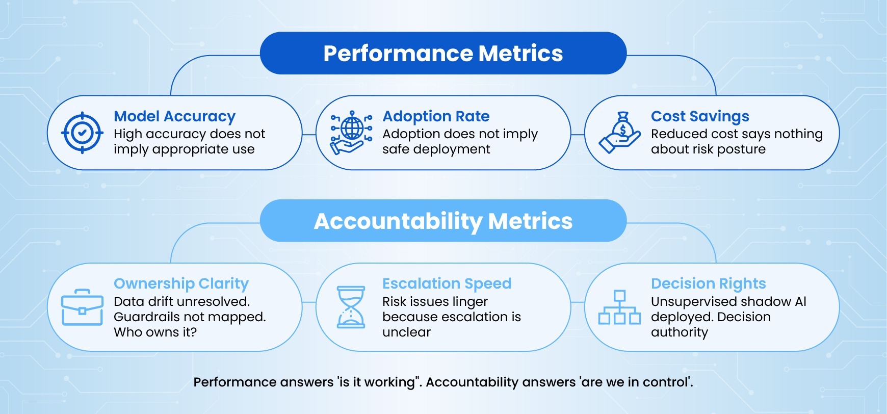 Most AI reporting still focuses on performance factors, including accuracy, adoption, and cost savings. These metrics matter operationally, but they do not answer the questions boards are responsible for answering. That includes who owns the risk, who makes decisions when things go wrong, how fast issues surface, and whether AI initiatives remain aligned to approved intent.