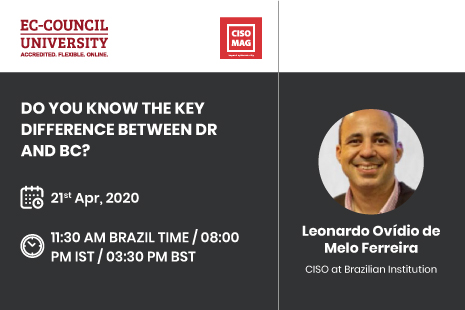 Speaker Leonardo Ovídio de Melo Ferreira , Designation: CISO at Brazilian Institution Topic: Do you know the key difference between DR and BC? Date of Webinar: 21st Apr, 2020 Time and Location: 11:30 am Brazil time / 08:00 pm IST/ 03:30 pm BST Watch Now Speaker Bio: Leonardo comes with more than 16 years of…