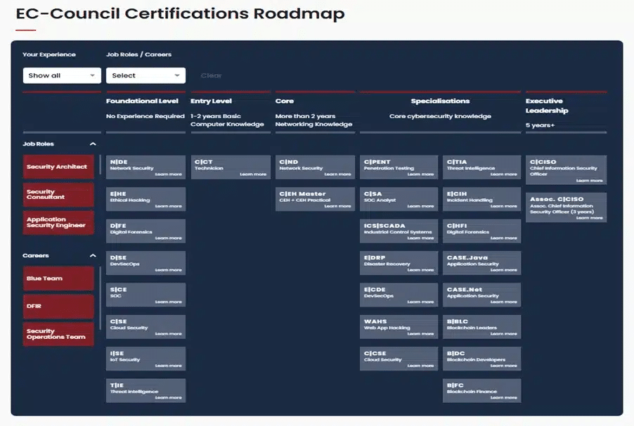 Now that you’ve explored a structured cybersecurity certification roadmap for 2026, the next step is to define your career path. Use the EC-Council cybersecurity certifications roadmap to identify the certification that best fits your current role and long-term direction.