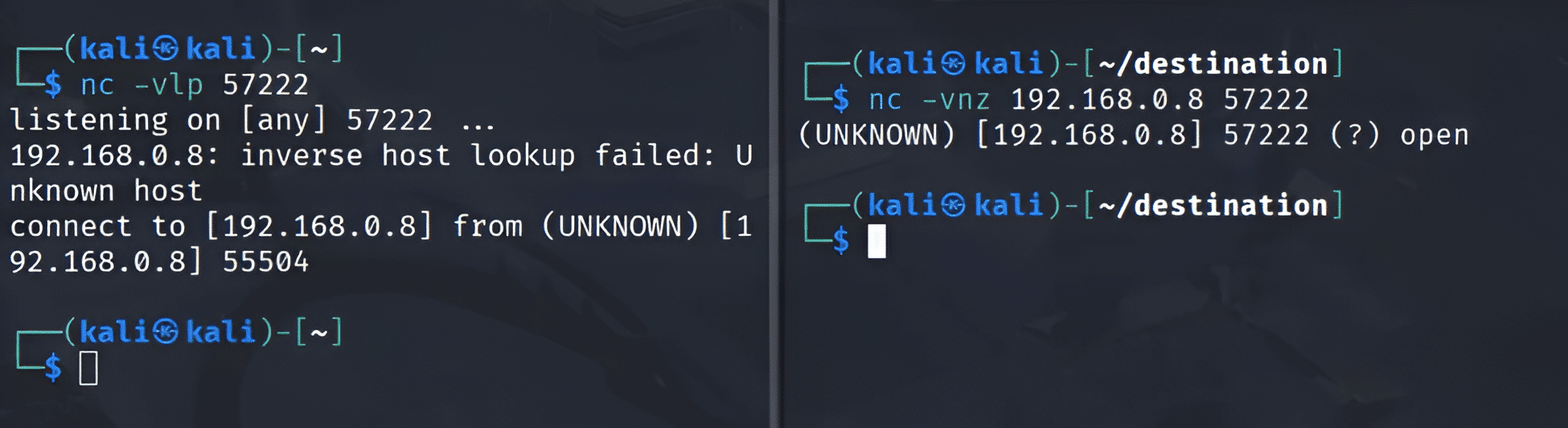 Figure 1 shows the procedure of port scanning with Netcat. The image on the left shows Netcat opening port 57222 and waiting for a connection from anyone. In the image on the right, the port scanning procedure starts with the -z option, which scans without establishing a connection on a specific port, in this case, port 57222. When Netcat arrives at this port, it avoids establishing a connection and gets only the port’s status; in this example, port 57222 is open.