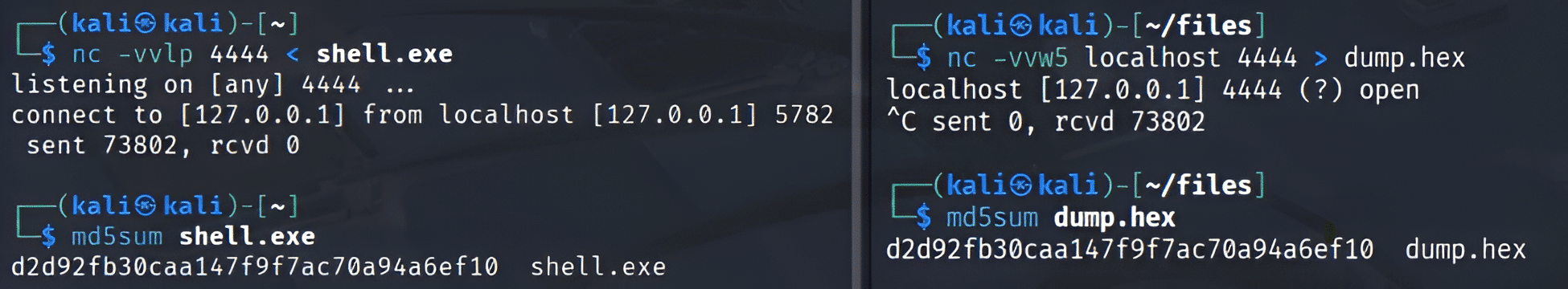 Figure 5 shows an exchange of data through a point-to-point connection using Netcat. On the left, we have a Netcat command listening on port 4444, followed by a < symbol and a file. This command means that a file named shell.exe will be the input when a connection through port 4444 is established. After the connection, 73802 bytes were sent, and an MD5 hash was sent to the server to compare the file’s integrity. If even a single bit of the file is changed, the hash will be modified. On the right of Figure 5, we have a connection on port 4444, followed by the > symbol and a file named dump.hex. This means the output of the connection will be sent to dump.hex. It is possible to verify that the same 73802 bytes were transferred, and the MD5 hash of the file transmitted matches. This shows that the file’s integrity was preserved.
