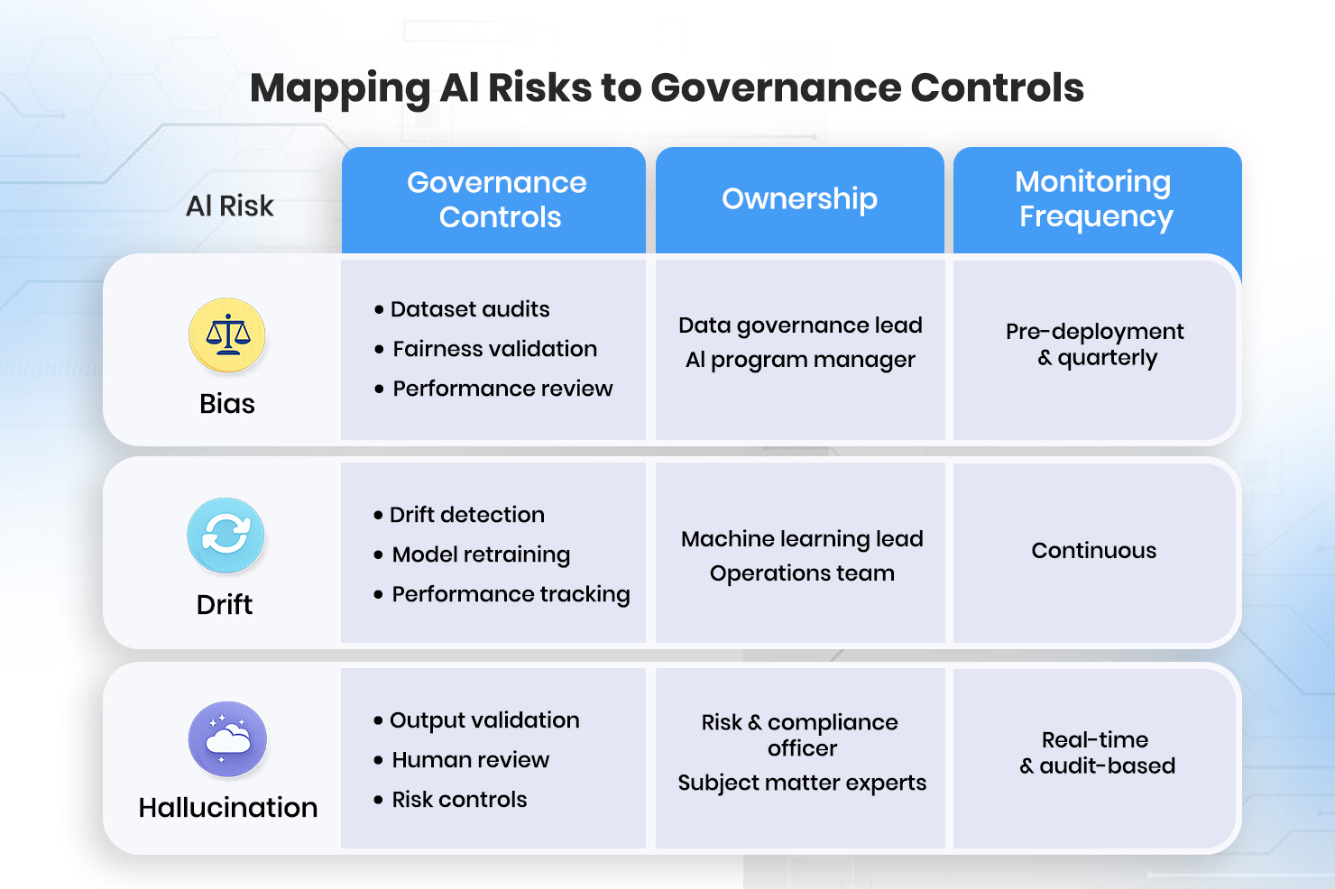 Effective governance begins by recognizing that different risks require different controls. Bias is best managed through data governance, validation practices, and ethical accountability. Model drift requires continuous monitoring, performance thresholds, and scheduled reviews. Hallucination demands usage boundaries, output validation, and human oversight. When these controls are applied consistently, AI systems become more predictable and easier to manage.