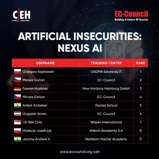 EC-Council extends sincere congratulations to its Accredited Training Centers: DAGMA Szkolenia IT in Polan , New Horizons Hamburg GmbH in Germany, Hacker School in India, Wissen International in Singapore, Altkom Akademia S.A in Poland and Redteam Hacker Academy in India. . These centers have delivered exceptional CEHAI training, guiding their students to excel and secure positions within the top ten ranks on the esteemed C|EH Compete Global Challenge Leaderboard.